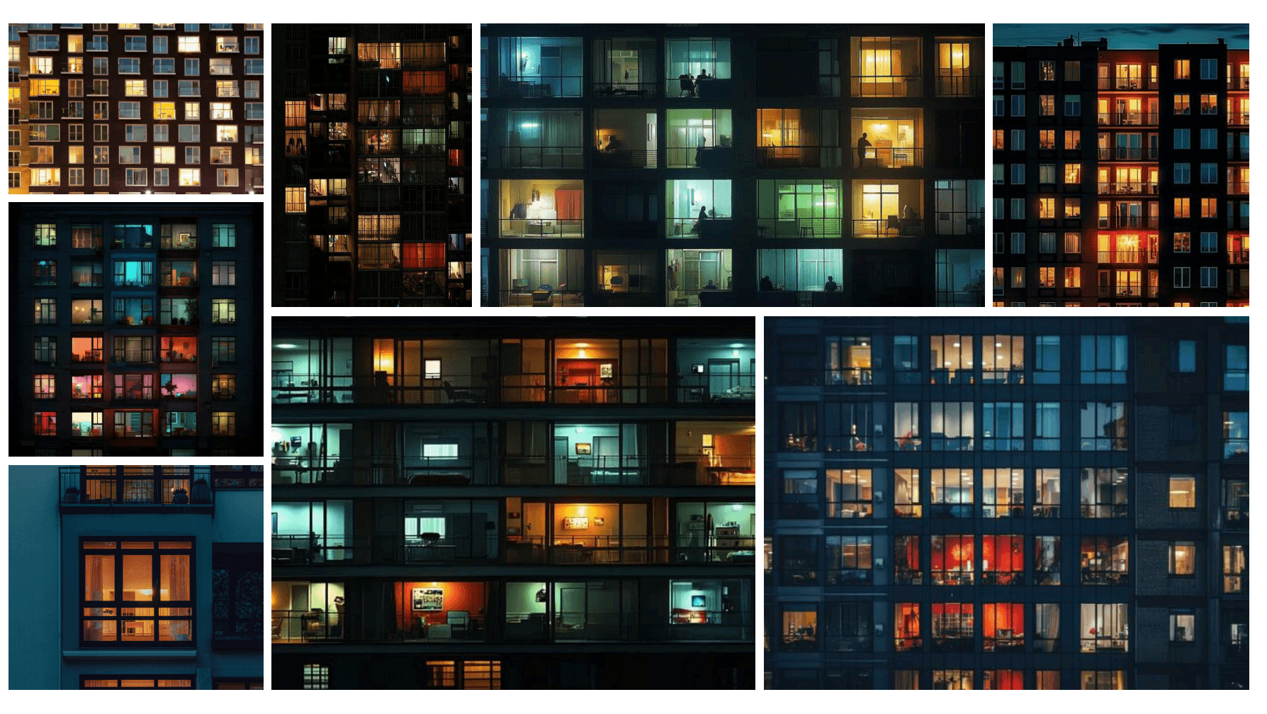 have always loved the idea of apartments or condos. There are a variety of different stories in each apartment, and No interior of the apartments look the same, and it reinforces the fact that everyone has their different story. each window of the apartment opens itself up to you. It is almost as if you are taking a glimpse into their story. This apartment building would feature one row of apartments, and the camera would orbit around the building, showing the different rooms in different apartments.