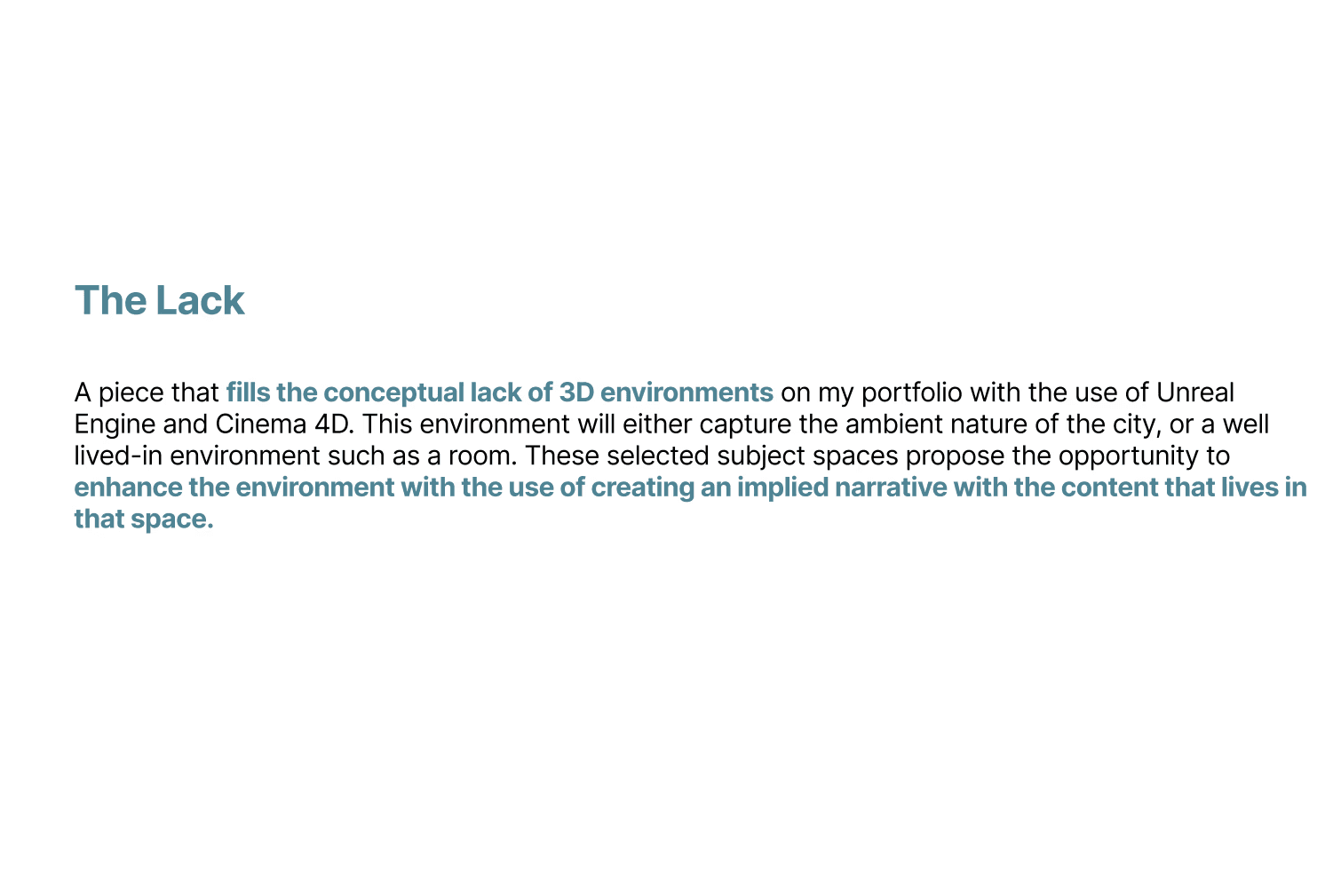 Find a lack or gap in your portfolio, and work on a quarter-long project that will fill it. In this case, my gap in my portfolio was a lack of 3D environments that follow a narrative.
